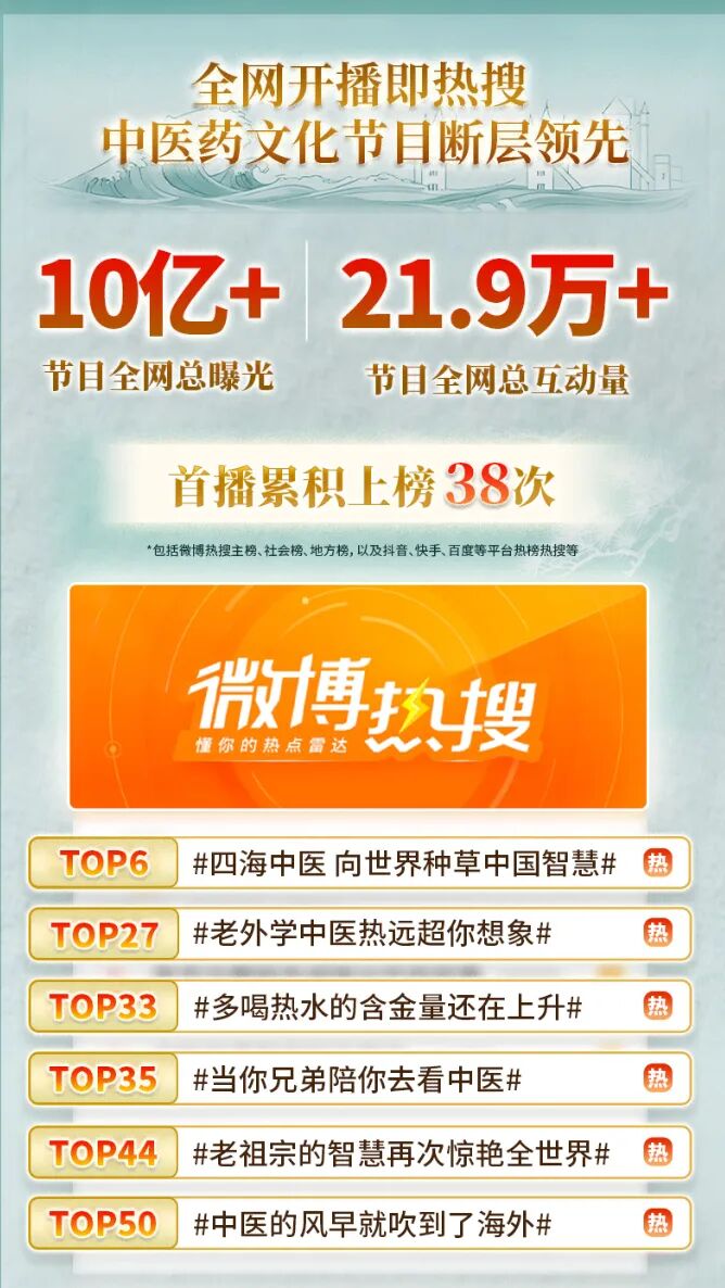 《四海中医》首期节目通过凤凰卫视中文台、香港台、欧洲台、美洲台四台联播,吸引超300万家庭观众收看,大湾区最高收视份额达4.5%。《四海中医》也在优酷、爱奇艺等网络平台上线,其中优酷人文、纪录片双频道冲上文化上新榜No.1,爱奇艺纪录片频道节目飙升榜No.1。目前,节目全网曝光已破10亿、全网总互动量近22万,首播累积上榜38次,成为近期中医药文化类节目中的现象级作品。