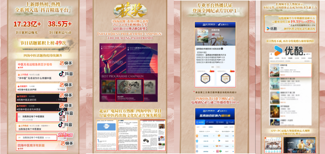 自《四海中医》开播以来,节目因“真实故事+文化深度+品牌温度”的特点,在海内外各大平台掀起评论热潮。截至目前,节目全网曝光突破17.23亿+,创优酷27%超高完播率。海内外机构对节目高度认可,北京广电局官方、印尼食药监局分别热推、转发节目,系列宣传片获2025GEMA亚洲国际银奖,尽显中医药文化出海的影响力。