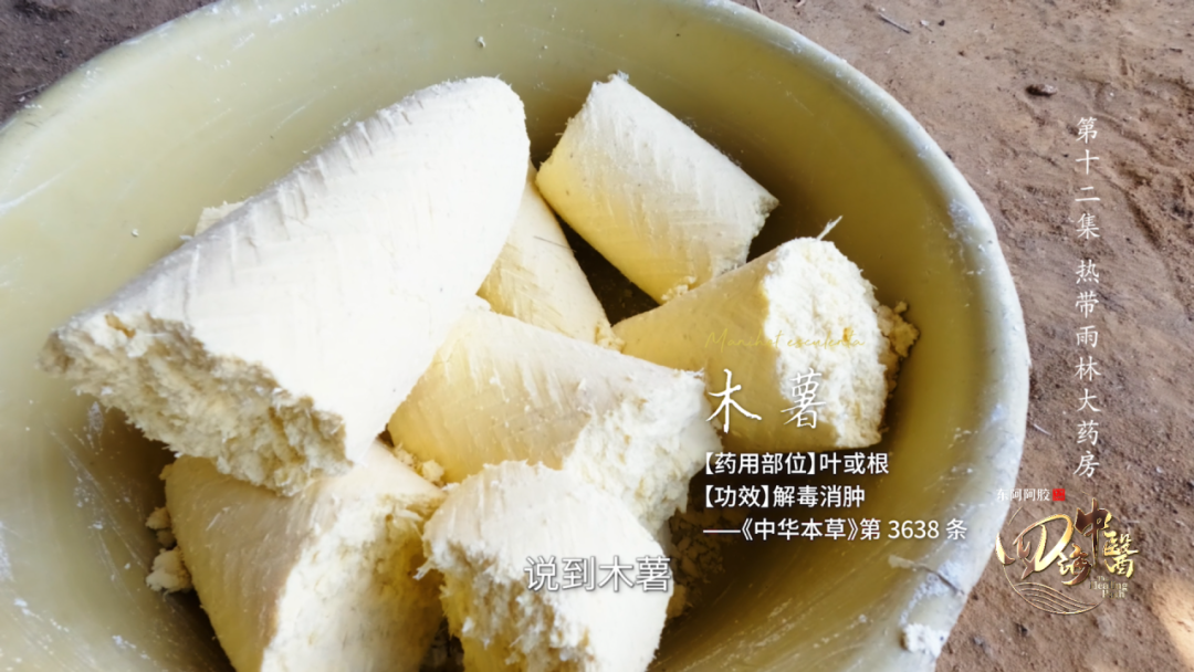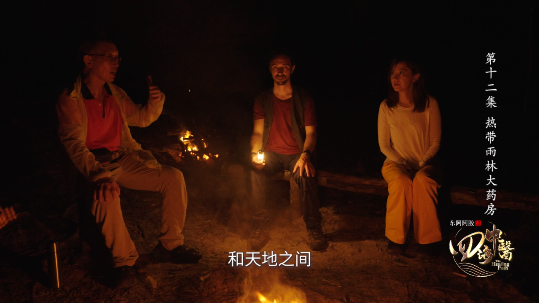 主持人与赵中振教授、Caio博士在塔图约原始部落土著叶帕松尼的带领下深入亚马逊雨林,了解了当地土著通过敲击阿拉巴树传递讯息,涂抹蚂蚁液防蚊,采挖木薯作为主食的日常生活。夜晚,叶帕松尼家人燃起松脂篝火,吹奏传统乐器为三人进行传统疗愈。在袅袅篝火与古老音乐的环绕中,三人切身感受了巴西原住民与中医思维相似相通的生存智慧。