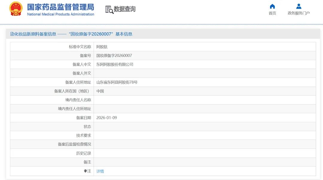近日,东阿阿胶股份有限公司(以下简称“东阿阿胶”)研发的 “阿胶肽” 正式通过国家药品监督管理局化妆品新原料备案(备案号:国妆原备字20260007)。这是东阿阿胶继驴油、驴乳粉、阿胶粉完成化妆品新原料备案以来的又一里程碑事件,标志着东阿阿胶在化妆品原料端已构建起涵盖大分子原料与小分子肽的多元储备格局,进一步夯实药品、健康消费品“双轮驱动”的发展模式。